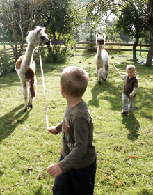 Dauer und Ablauf Die Hauptbestandteile der Therapie setzen sich aus der Kennenlernphase, dem Erlebnisspaziergang, dem Versorgen der Tiere und dem Ablegen einer kleinen Prüfung für den „Alpakaführerschein“ zusammen. Im Anschluss wird aus der Alpakawolle mit den Kindern ein Talisman gefilzt. Die Therapie dauert je nach Teilnehmerzahl 4 bis 5 Stunden. Der Alpakaerlebnistag kann auf dem Gelände des Haustierpark Lelkendorf - www.haustierpark-lelkendorf.de - bei Teterow statt finden. Dieser bietet alle Grundvoraussetzungen für die Ausrichtung, wie z.B. sanitäre Einrichtungen, eine Gastwirtschaft, eine große Spiellandschaft, einen Fußballplatz, ausgedehnte Wald- und Feldwege, eine Halle für schlechtes Wetter und natürlich eine große Anzahl von seltenen Haustierrassen aus der ganzen Welt. Die Therapie kann aber auch an anderen Orten stattfinden. Wichtig ist hier eine vorherige Absprache, da die Wege für den Spaziergang im Vorfeld besichtigt werden müssen. |